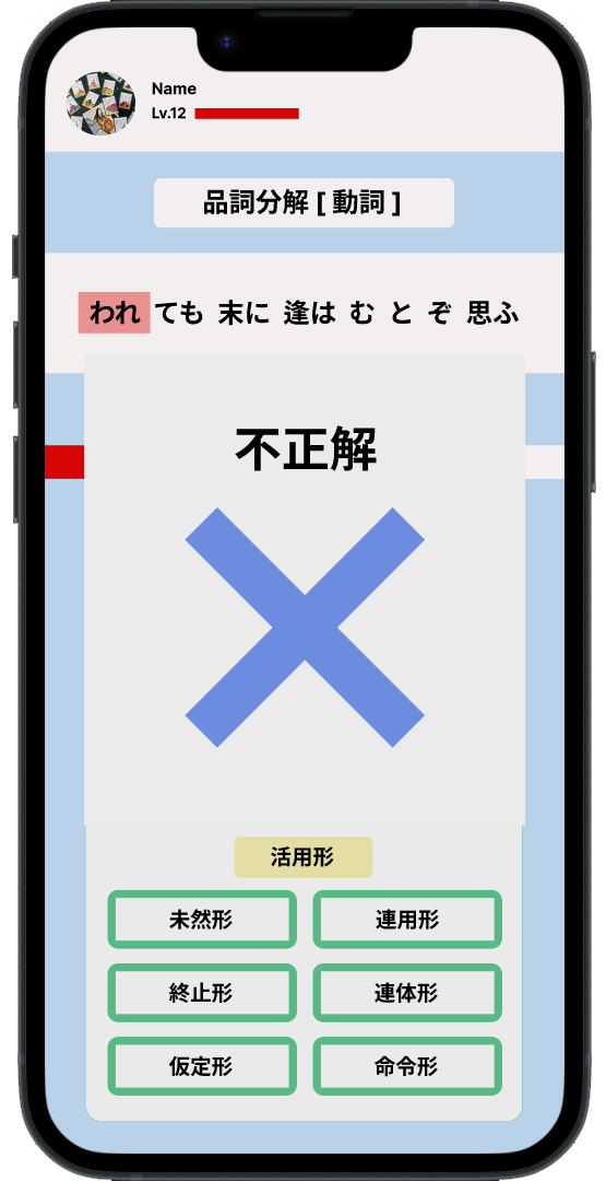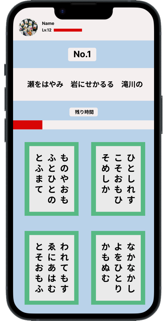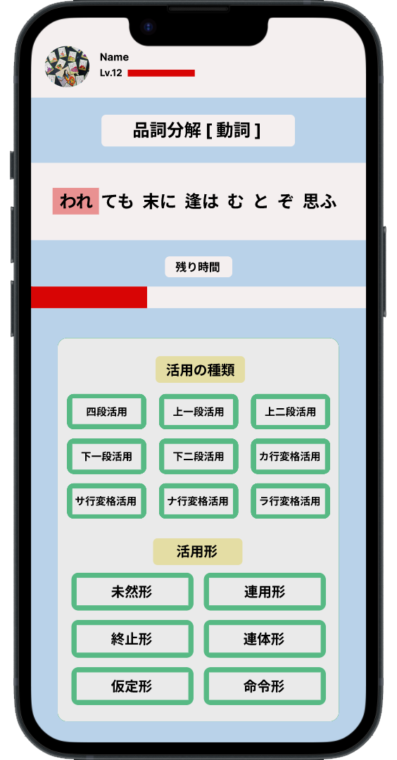 通常の百人一首→品詞分解 動詞→助動詞→古典単語の順番で問題に答えていく形式